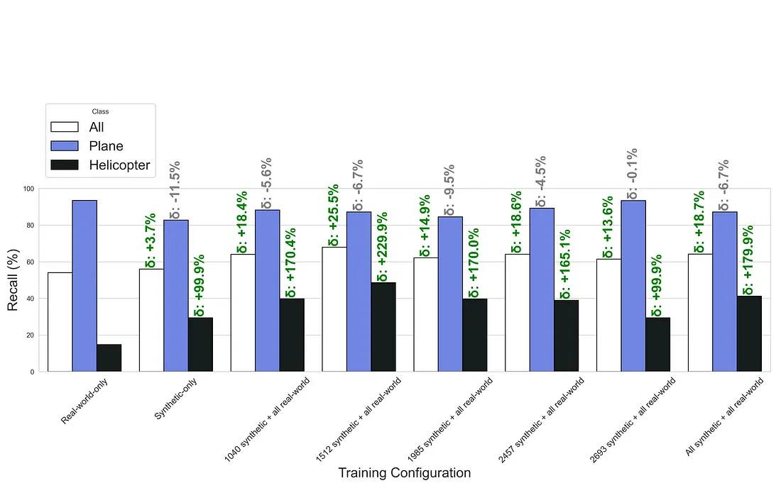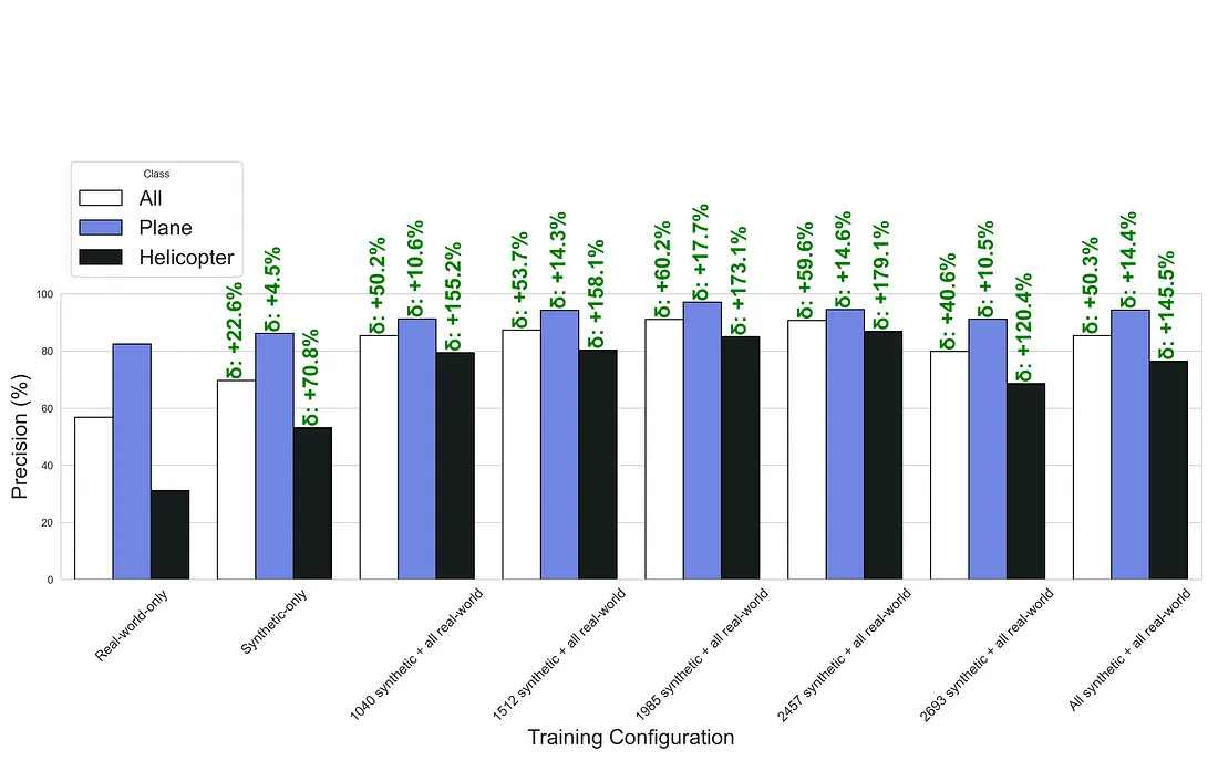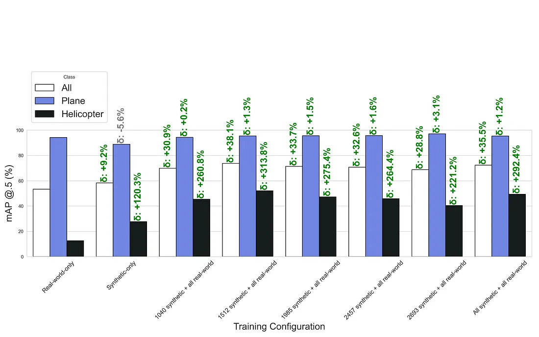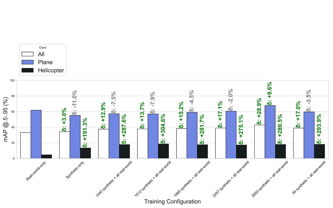 The evaluation metrics are also visualized for each training configuration in Figures 7, 8, 9, and 10 in Appendix B. In these figures, each training configuration is represented by a group of three bars corresponding to the ‘All’, ‘Plane’, and ‘Helicopter’ classes. The bar charts display Precision, Recall, mAP@.5, and mAP@.5:.95, respectively. The relative percentage change compared to the real-world-only baseline is annotated above each bar, indicating the performance improvement or decline for each class. These visualizations provide a clear comparison of the models’ performance across different training configurations, highlighting the significant enhancements achieved by combining synthetic and real-world data.