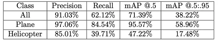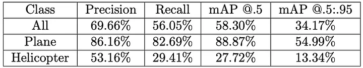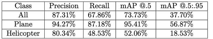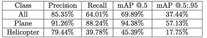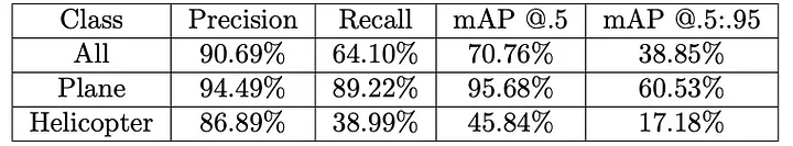 Based on the results, it can be concluded that the models’ performance dramatically improved with the combination of synthetic and real-world data. In the majority of cases, the metrics are remarkably four times better, and the models even performed better on airplanes than when trained with real-world-only data.