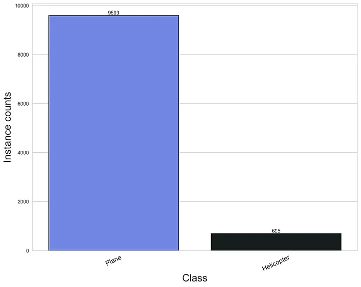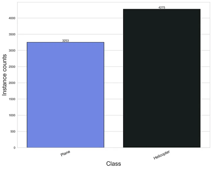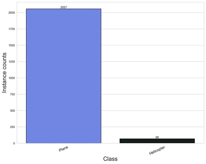 After the training and validation datasets were assembled, the object class distributions were examined. Figure 2 shows training, while Figure 3 shows the validation class distributions. It can be concluded that both the training and validation datasets are heavily unbalanced, with helicopters being significantly underrepresented. These histograms suggest that a detector model could be trained that is performing well on planes, but poorly on helicopters.